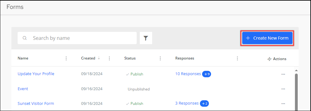To create a new form, navigate to Forms in the left-hand menu. Click the ‘Create a new form’ button located in the upper right corner of the tool window.