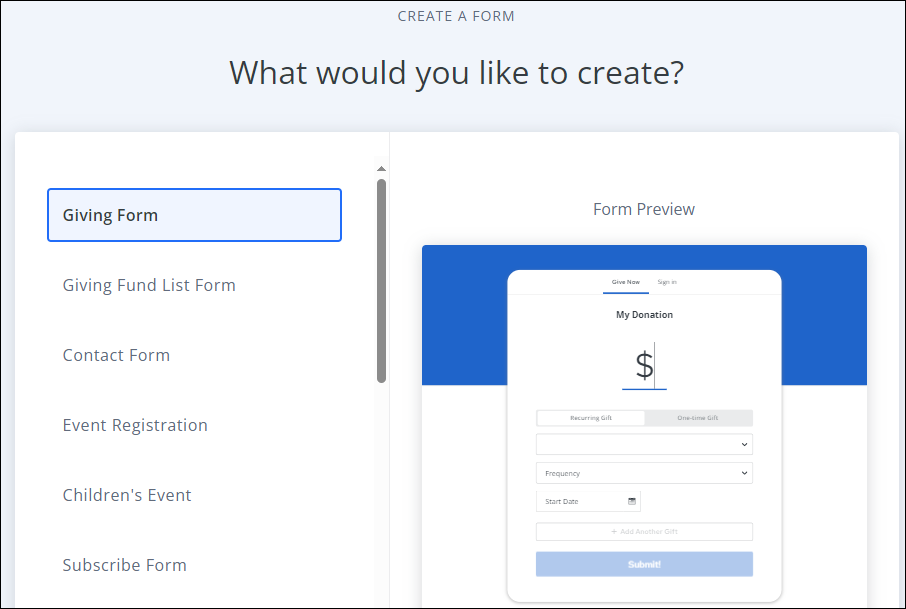Once a template option is chosen, give the form a Name. Then, click the Start Building Form button. This will load a new form into the form builder where the Form’s properties can be adjusted, new fields added, adjust existing fields, and manage payment options (** if combined with Giving **).