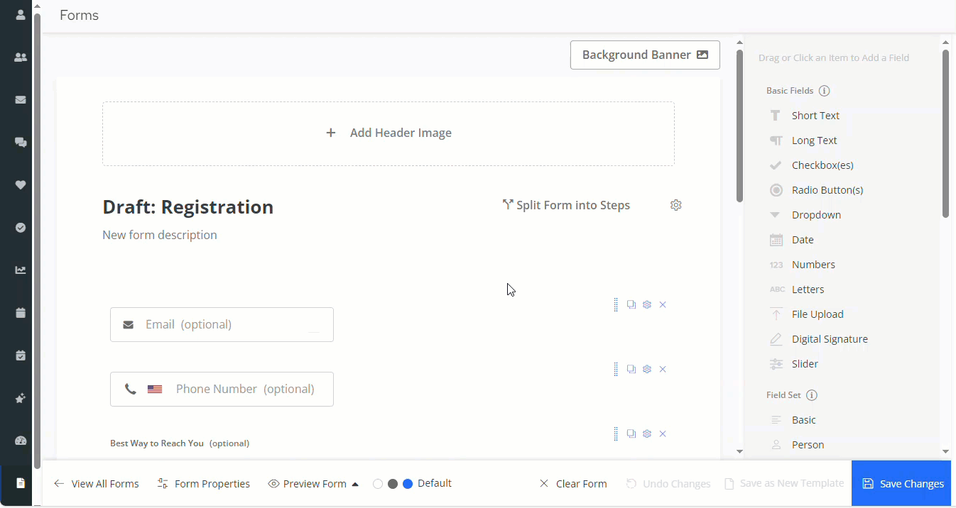 - Clear Form: resets the Form back to a blank canvas for starting from scratch. Use this option to wipe all fields off the form and start over again.