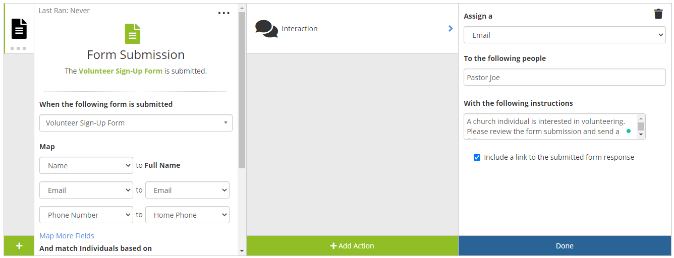 - Example: An individual fills out a volunteer sign-up form and is interested in serving in Student Ministry. A workflow can be built to assign an interaction to the Student Pastor to follow up with the individual to take the next step in the volunteer sign-up process.