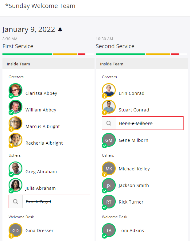- Once your schedule has been created you are able to see your volunteer team organized by date. Here, you can manage team availability, send out communication and find replacements if need be.