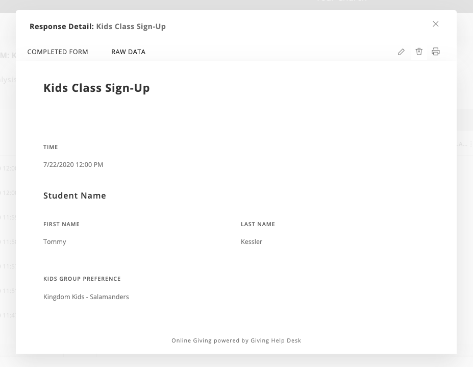 You can also edit, view, save or print individual forms as they were completed by the registrant or donor by clicking on the Created date. You can select to print or save only the Raw Data if that's helpful. Note: not all form response fields can be edited. Payment fields are blocked for edits by design.