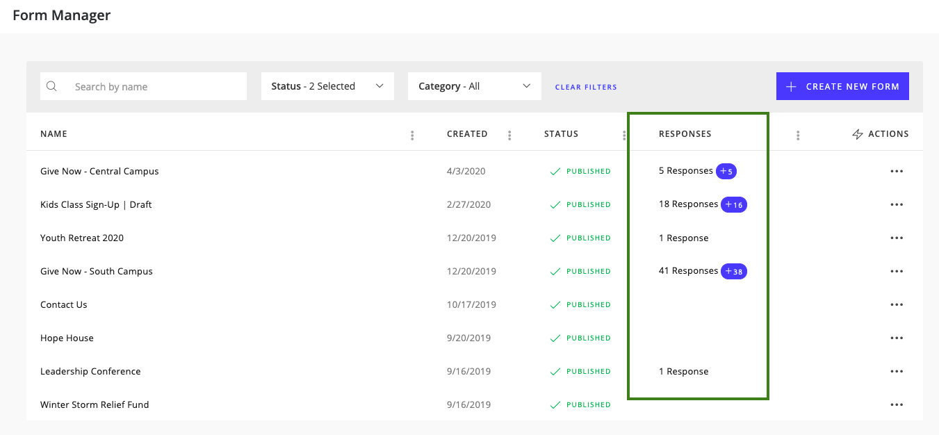 Whether you've used forms to collect prayer requests or t-shirt sizes, you'll likely need to access and share that information. On the main Forms Manager page, locate the Responses column.
