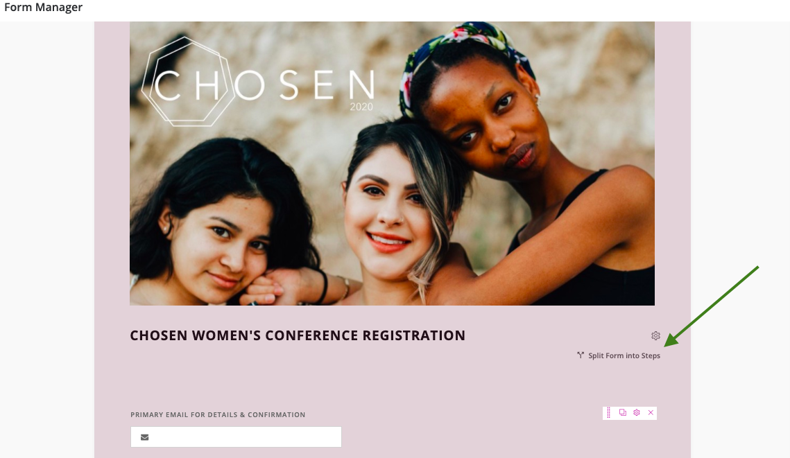 However, if your form is longer, (e.g. an event registration form with multiple sections) you have the ability to separate the form into steps. This option is visually less overwhelming to the giver or registrant, and allows for easier navigation from one section to another. If you'd like to break your form into steps, simply click the Split Form Into Steps button at the top right of your form.