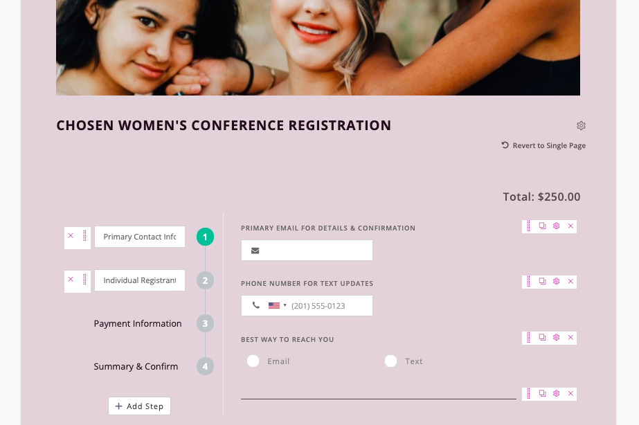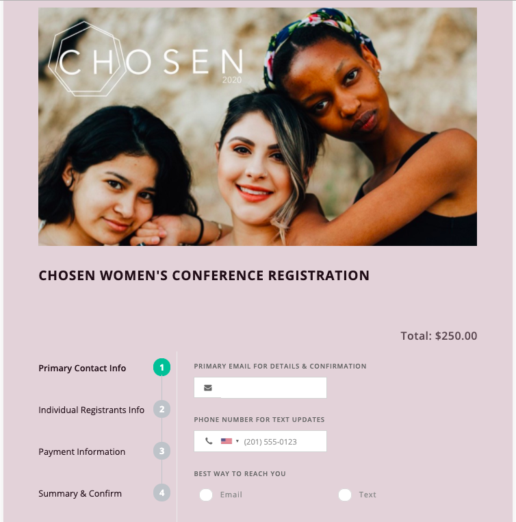 Below is how the finished form will appear to your registrants. They will not be able to move to the next step without completing the one before it. Once a step is completed, however, they will be able to navigate back to a completed section using the step timeline on the left if edits need to be made. If a payment is required on the form, a running total will also be shown on the top right side of the screen for each step for their convenience.