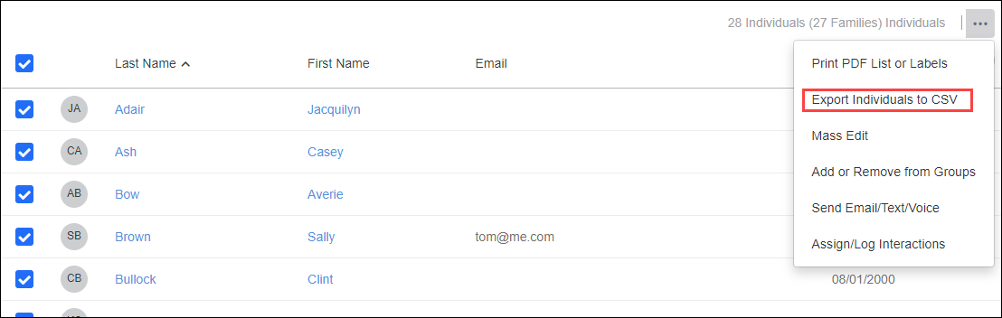 Anywhere you see a list of people, look for the Three-Dot Actions icon at the top right. Click, expand, and select "Export Individuals to CSV."