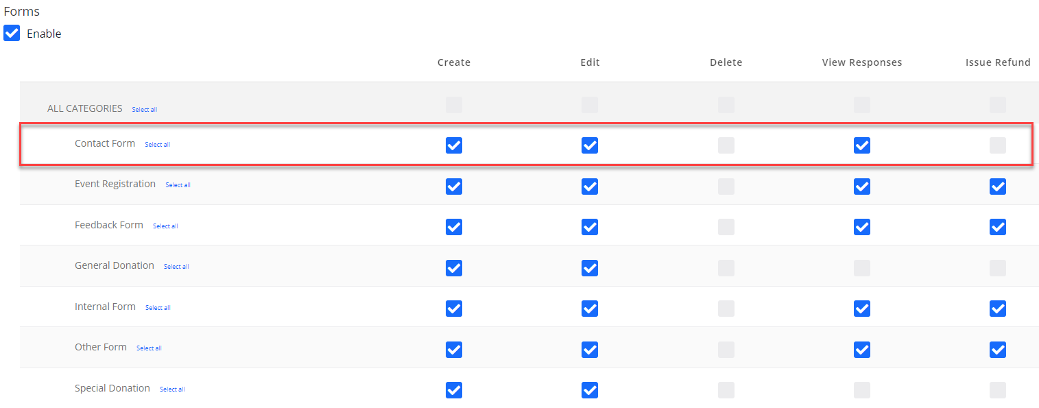 - Customize the permissions based on the type of form and the categories you would like the user to have.