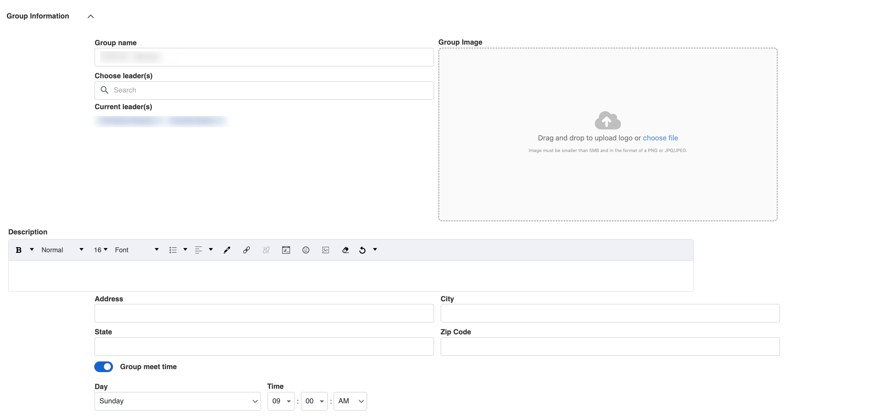 • Group Image: New!! Upload an image to represent the group. Drag and drop a file or click choose file. Images must be under 5MB and in PNG or JPEG format.