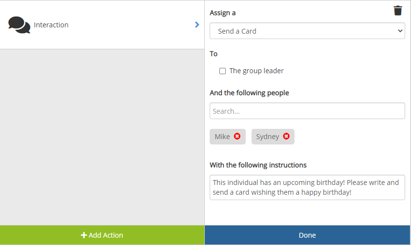 Use the action type(s) that best fits your context and the overall goal you are looking to accomplish. You can send an email, send a text, assign an admin message or assign an interaction like what has been done in this example.