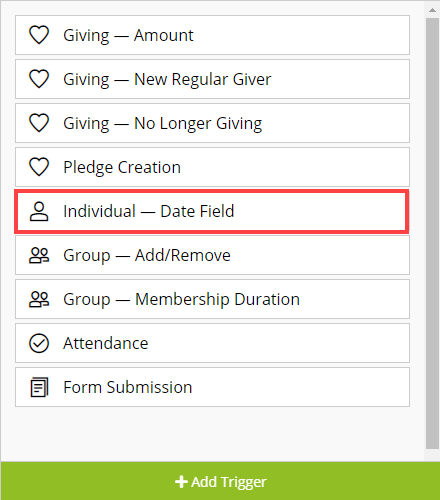 If there are no Workflows, start with Building a Workflow. Otherwise, select your desired workflow, select + Add Trigger and select Individual-Date Field.