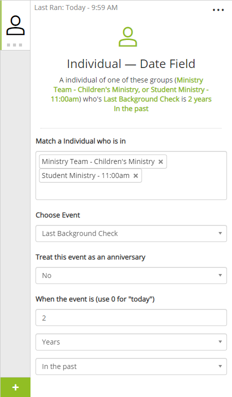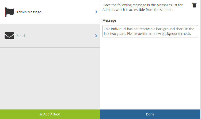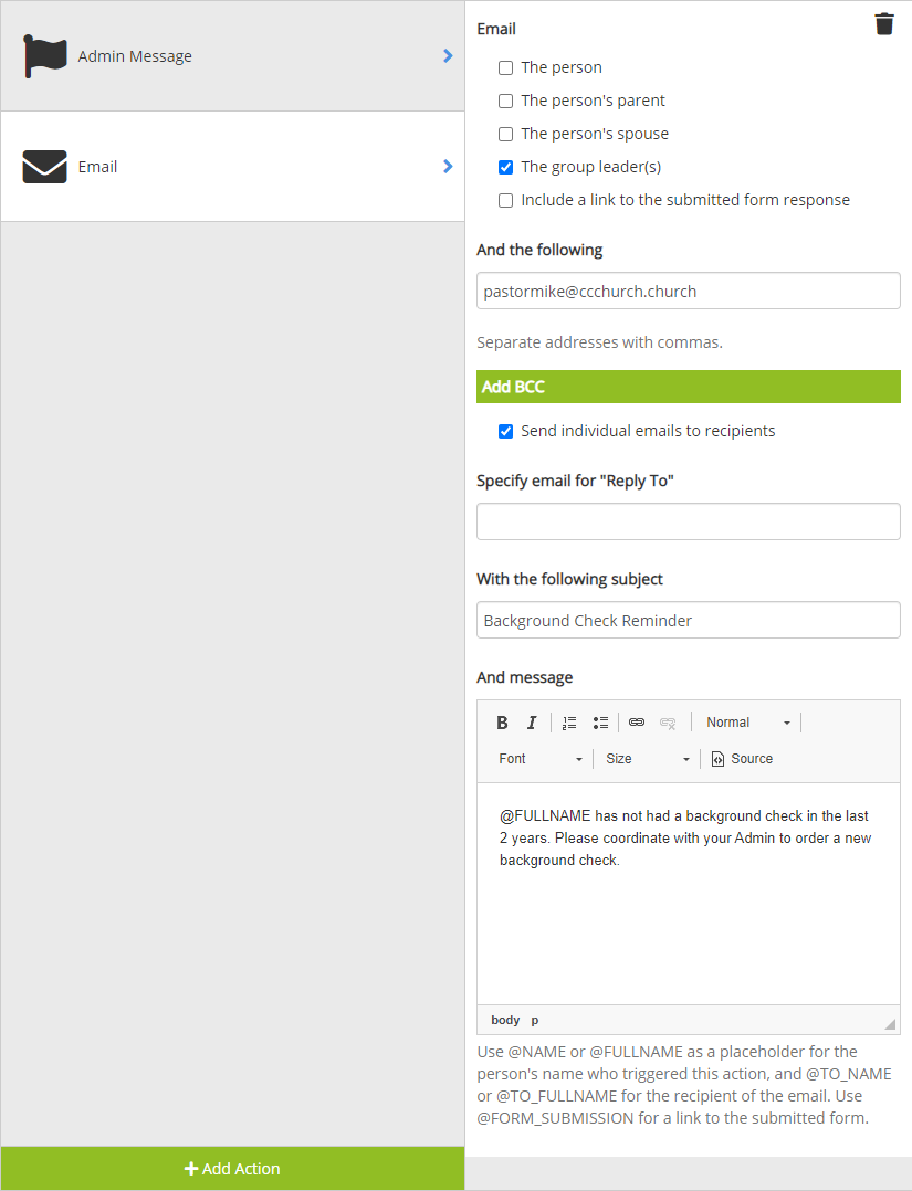 Example: I would like to perform background checks every two years on my volunteers serving in areas with kids. I would also like the workflow to alert the pastor of that ministry and the admin to perform the background check.
