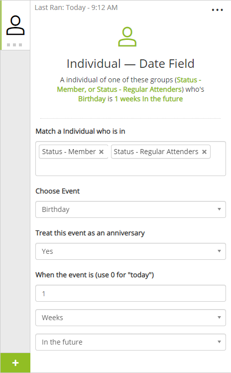 Select a Group or Groups that you would like to add an individual from. Choose the event that the workflow will trigger off of and choose whether it is an anniversary or not. This tells the system that this event happens annually, which in turn will trigger the actions annually. Finally, set the logic for the time based In the Future or In the Past.