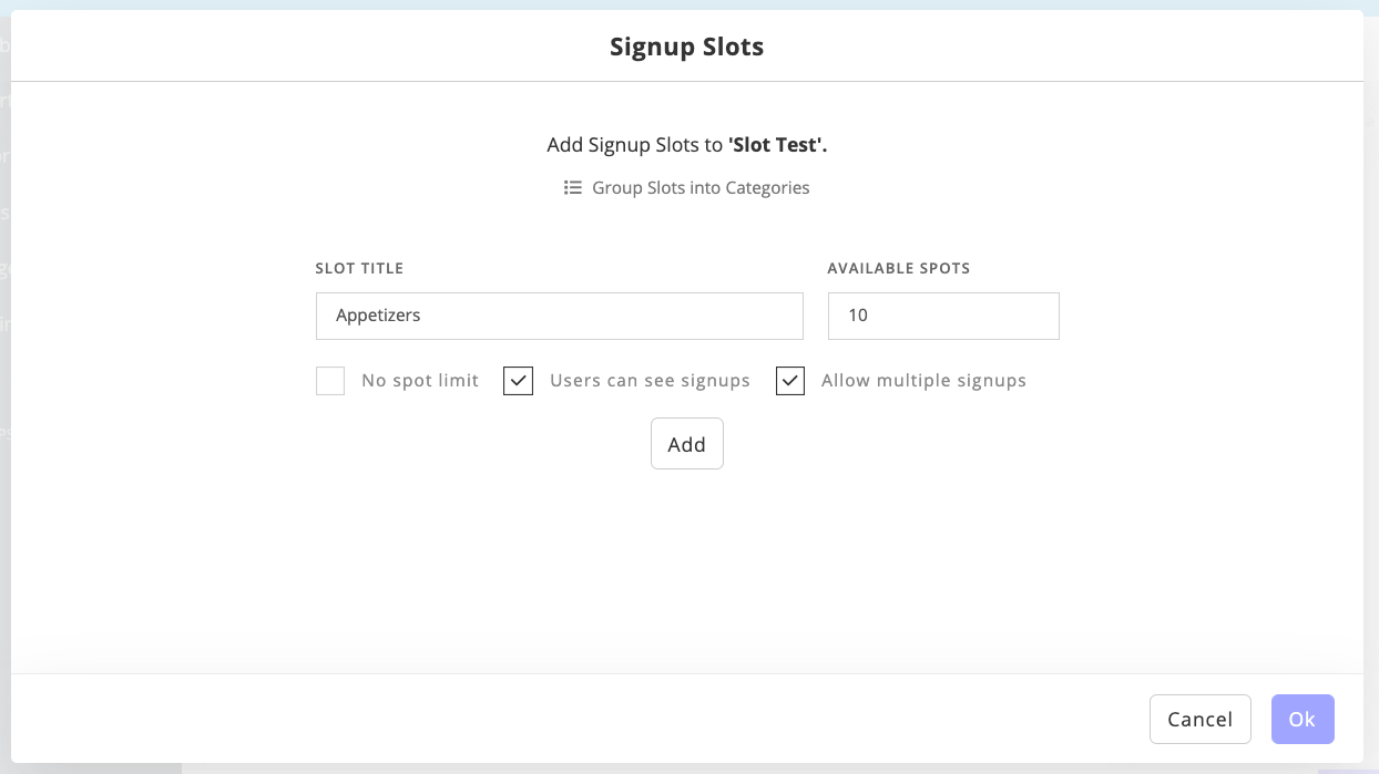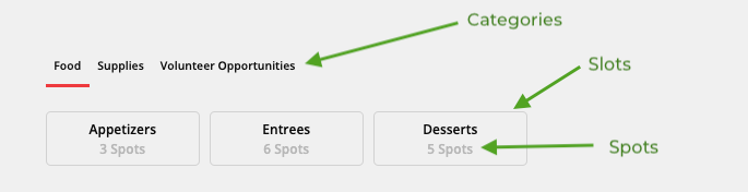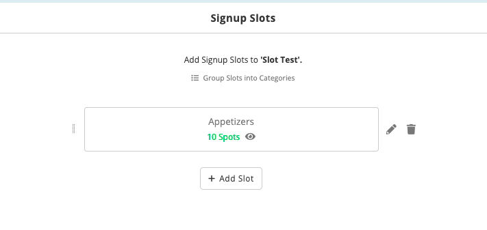 In the example below, "Appetizers" is the Slot Title. We have entered "10" for Available Spots because we will need 10 appetizers for our event.