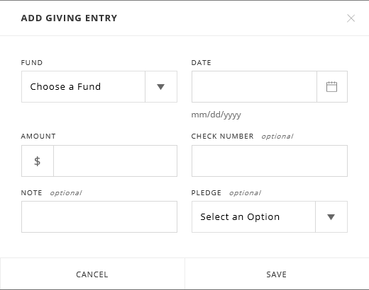 To add a donation to an Individual record, navigate to Individuals and search or click on an individual’s name. Click the Giving tab and then select + Giving Entry.