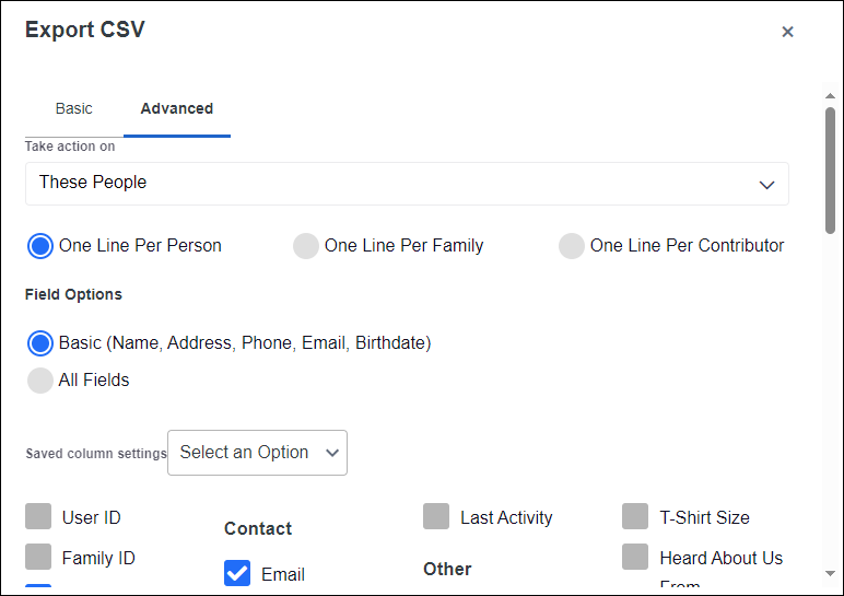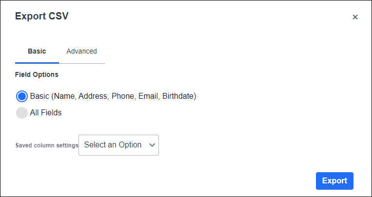 Choose from the available options to pull in other family members and the level of detail to include in the Export. Once all the options are in place, select the EXPORT button at the bottom of the modal to get your exported CSV file download right away.