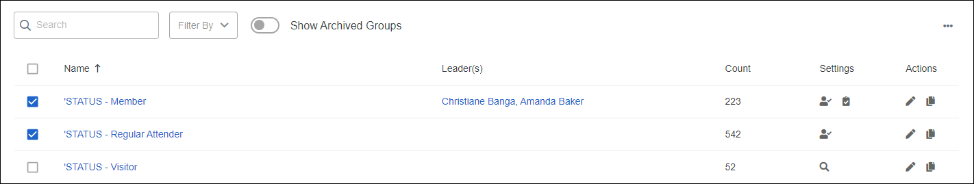 To start making your printed directory, make sure all the members are in a group(s). This is the list of names that will be used to build the document output. Go to Groups → List, check the box(es) next to the group(s) for which you want to print a Directory.