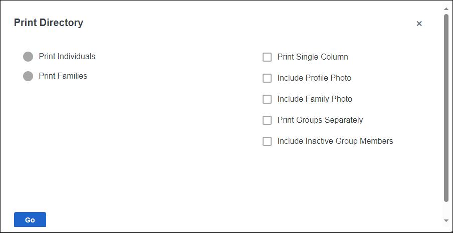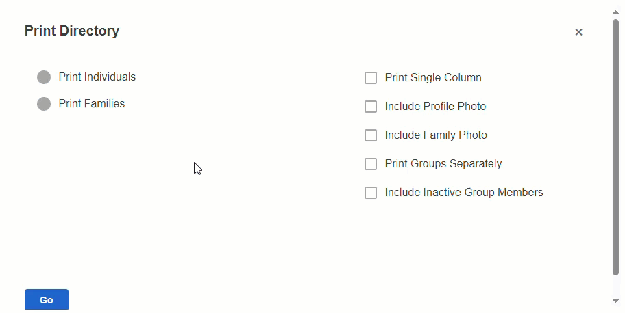 - Print Groups Separately → Gather the members in the output by the selected Groups. Helpful for multiple small group directories.