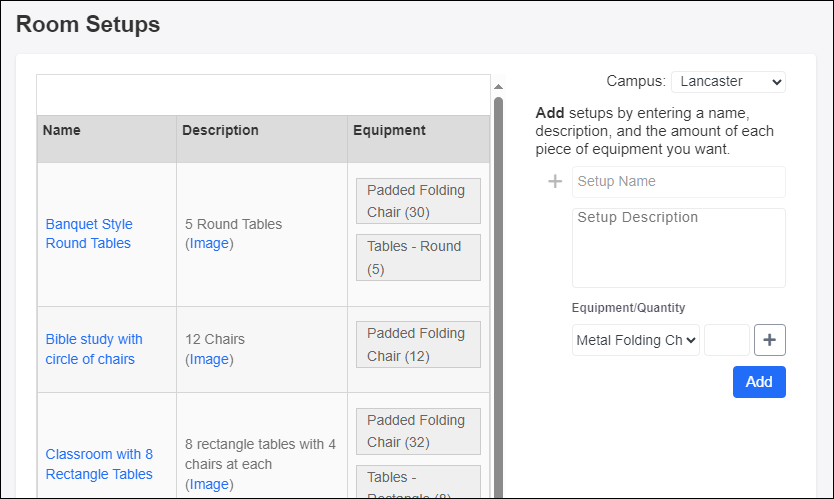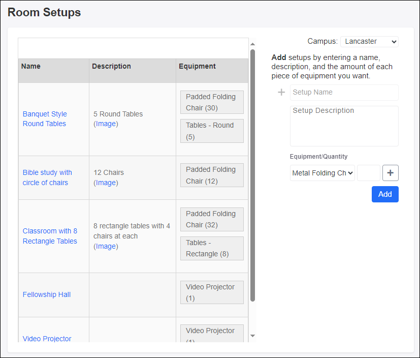 A Room Setup is one way to group equipment that commonly goes together, but you could add additional items after you have chosen the setup. If you have more than one Campus, you can toggle between campuses by selecting the Campus drop-down in the top right-hand side of the screen.