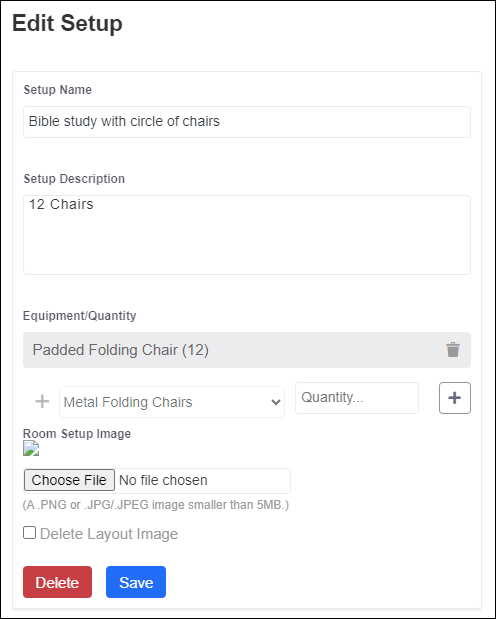 - Add a layout image. This can be helpful to show what the room looks like for an ideal setup reference. Or, even provide a general layout or location map. To update or delete the image, just upload a new one or use the checkbox to 'Delete Layout Image' and then Save.