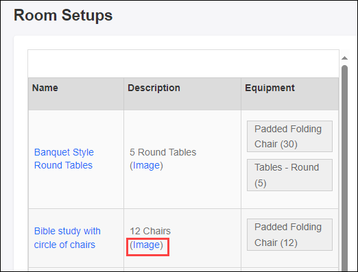 Any Room Setup that has an image added to it will get a notation in the setup list so it is easily visible. Click to select the 'Image' link and view the image right from the list.