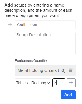 Start by adding what your setup should be called, give it a description to set expectations, and start adding your equipment based on what is created in that area. To add multiple equipment lines to a room setup, use the + button keep adding more items.