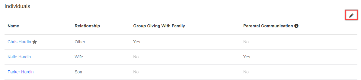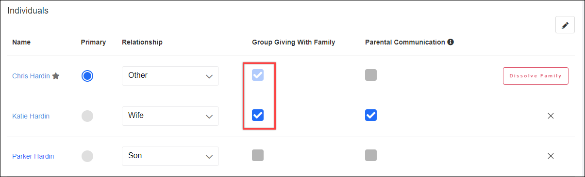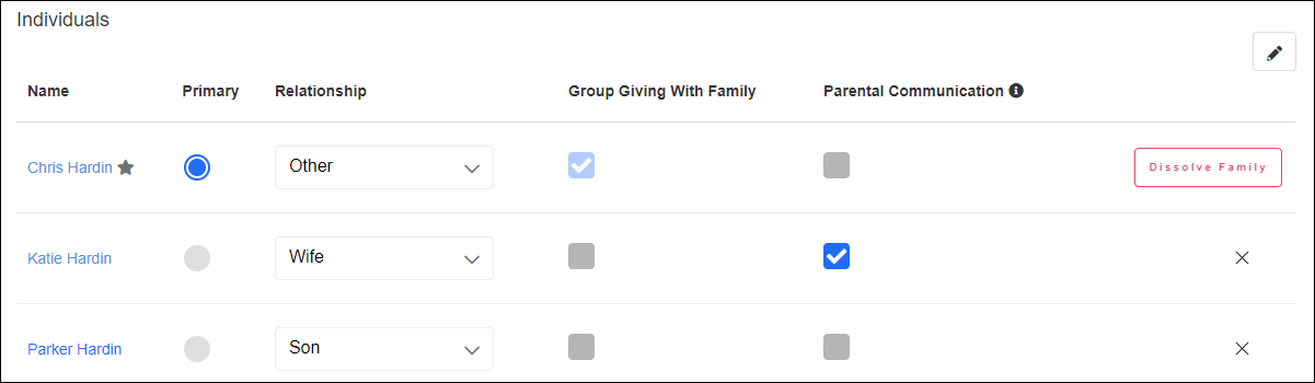 To change the primary in the linked household (this is the person you can move all the donations to), use the following process. Select the pencil icon in the Family tab to edit the relationships.
