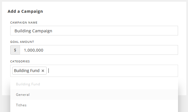 - Create a separate campaign for each fund for which you receive pledges (e.g., Offerings 2025 Campaign – General Fund, Christmas Offering Campaign – Christmas Fund, etc.).