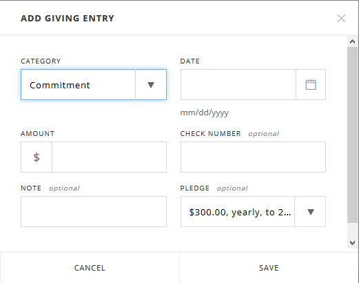 You can input giving towards a pledge from the individual’s record. Navigate to Individuals and search or click on an individual’s name. Click the Giving tab and then select + Giving Entry. Select the Fund from the drop-down list and enter the Date, Amount, and Check Number. The pledge will be auto chosen based on the Fund selected.