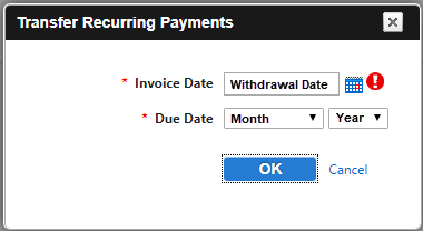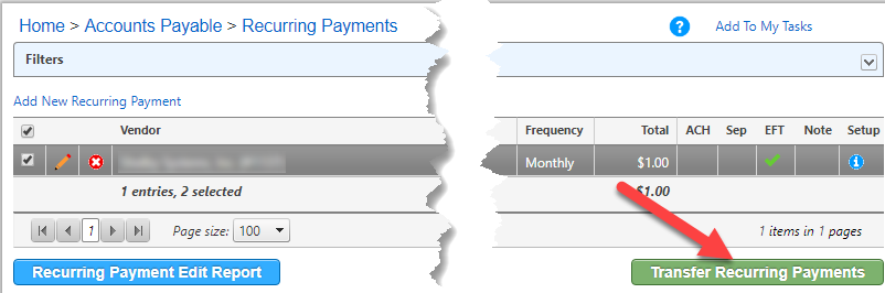 Each month, when you receive notification of your Giving fees, return to Financials > Accounts Payable > Manage > Recurring Payments and select the recurring payment. Click Transfer Recurring Payments. Use the date the fees were withdrawn from your account as the Invoice Date and the correct month and year as the Due Date.