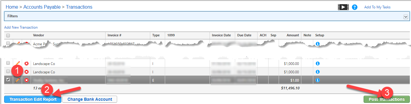 When you click OK, the recurring payment will be duplicated and placed into Manage → Unposted Transactions. Click on the pencil icon next to the new payment and edit the Due Date and the amounts in the Invoice Total and line item boxes to match your report from Giving. Click Update to return to the Unposted Transactions screen, view the Edit Report by clicking the Transaction Edit Report, then click Post Transactions and follow your normal posting steps.