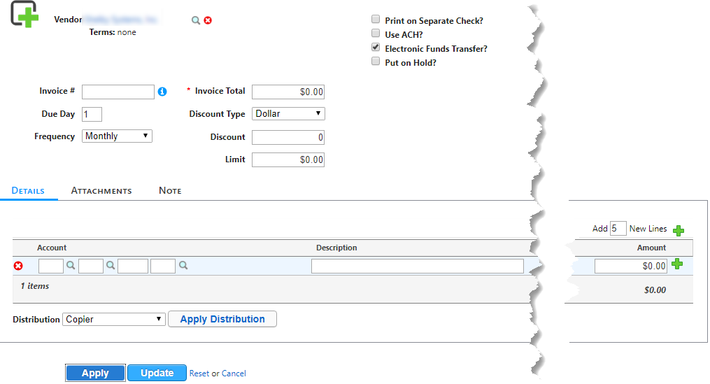 The Invoice Total can be edited each month once the invoice has been duplicated into your Unposted Invoices area of Accounts Payable. For now, enter $1.00 into the line item Amount box(es) and the sum of the number of line items into the Invoice Total box.