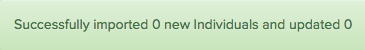 If, when attempting to import your individuals from a CSV file, you receive a message that says, "Successfully imported 0 new Individuals and updated 0", this usually means that the column headers you typed in on the Import Individuals page didn't match the column headers from your CSV file. Remember, you will need to copy the column header from your CSV file and paste it into the corresponding field on the Import Individuals page. Using the copy/paste method will ensure that the correct syntax is in place so your People Software knows which fields to place where. If your CSV file has "Name" for the column containing first names and you type "First Names" on the Import Individuals page, the information will not transfer properly.
