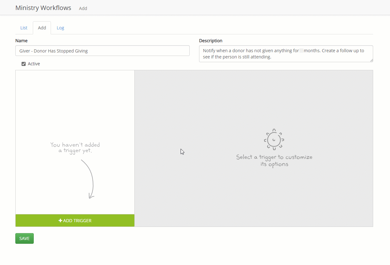 Now, add triggers to start building the actions of your Workflow. Since we are working with donations, the Giving-focused triggers are what we want to use. Specifically the Giving - No Longer Giving trigger.