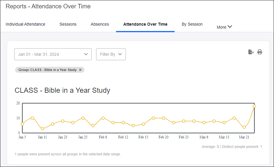 - This will automatically populate a report that will show you graphs of groups with attendance sessions created over the time range defined. If there are too many groups to show, the report will require you to choose a set of groups or an aggregate using the Filter By drop-down.